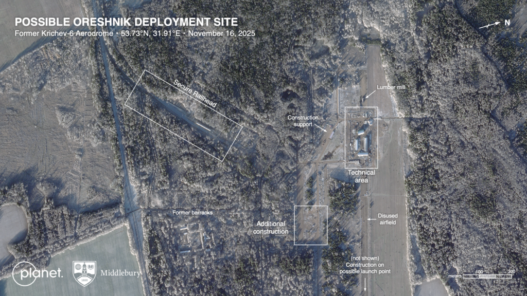 Researchers affiliated with Middlebury College have identified the likely location of Russia’s deployment of the nuclear-capable Oreshnik intermediate-range ballistic missile in Belarus using satellite imagery captured by Planet Labs. The location is the former Krichev-6 aerodrome, five kilometers from the Belarus-Russian border.