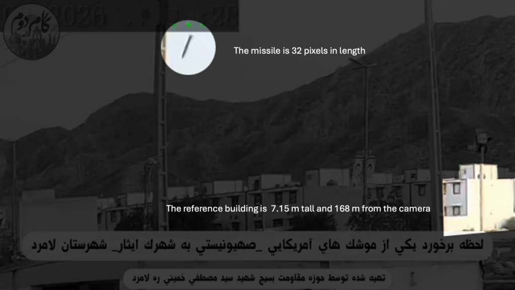 Iran released two videos taken by security cameras showing what appears to be one of three missiles that exploded in Lamerd, Iran. The apparent length of the missile is 4.6 m (+/- 0.7 m). The apparent length is more consistent with the 4.0 m-long U.S. Precision Strike Missile (PrSM) than with known Iranian land-attack cruise missiles, which are approximately ~6 m long or more.1 The apparent difference in length between PrSM and the missile in the image could easily be explained by motion blur from a fast moving (>100 m/s) object. Sources of uncertainty include the distance to the explosion distance, lens effects, stretching or skewing as the videos were compiled into the file placed online, and measurement error.