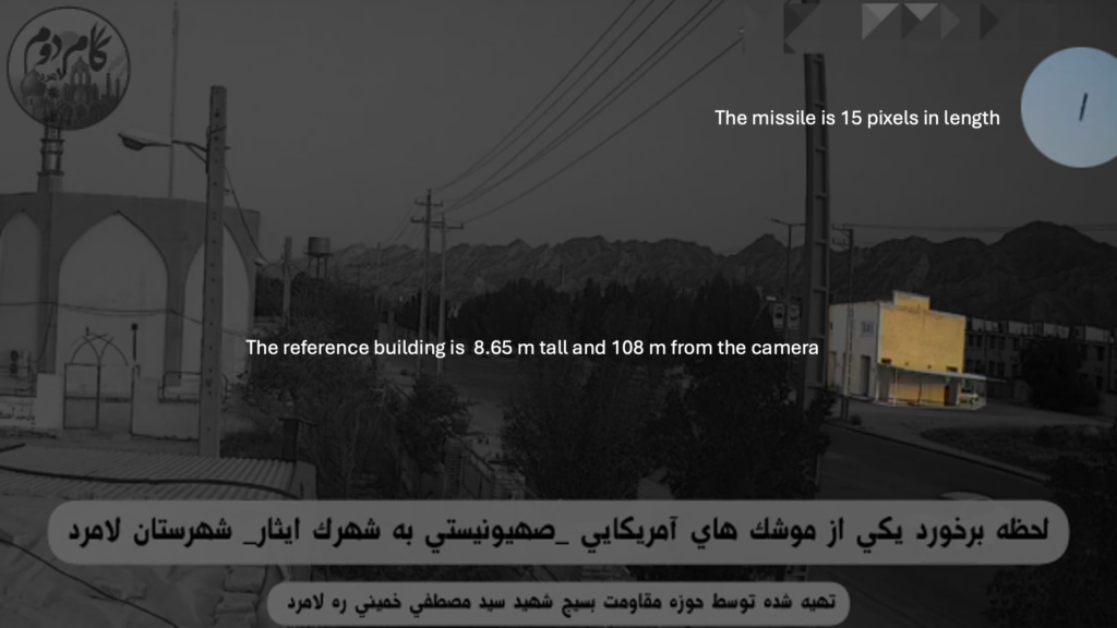 I then measured the pixel length of the missile in each of the images, as well as the distance from the camera to the approximate point of the explosion. Using the effective focal length derived from the reference buildings, we can estimate the size of the missile with the formula: