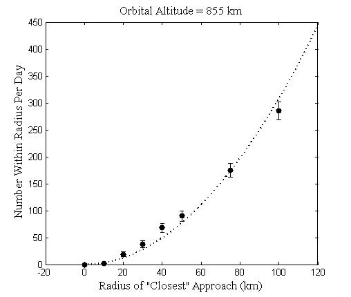This plot shows how often a cataloged object comes within a given distance of a hypothetical equatorial satellite at an altitude of 855 km. The dotted line shows how this would increase purely with cross sectional area (R^2).