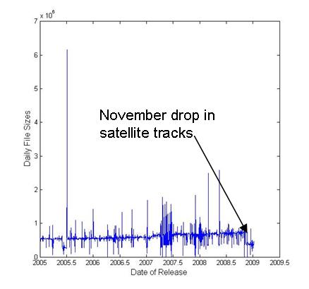 File size of daily orbital parameters distributed from the NASA space-track website. This is proportional to the number of satellites tracked each day, or at least listed as tracked each day.