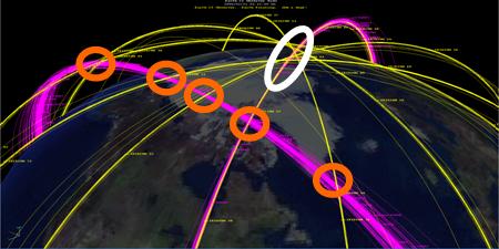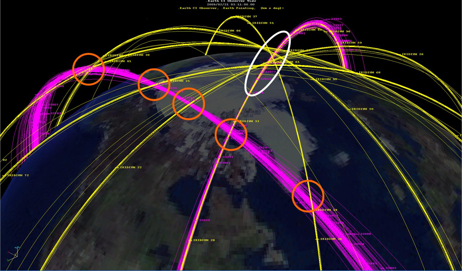 The Iridium satellites are shown in yellow and the pieces of space debris from the collision are shown in magenta. The white circle shows an area of Iridium crossings of the Iridium 33 debris above the North Pole while the red circles highlight the places were Iridium satellites cross the debris tube of the Cosmos 2251 satellite