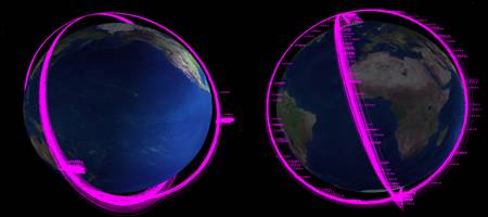 As of Friday, February 20, 2009, there were 212 pieces of debris from that collision cataloged (144 associated with the Cosmos satellite and 68 with Iridium). Both groups of debris are starting to spread out along their initial satellite trajectories. And this is just the first pieces that have separated from the swarm. As time goes by, the rest of the debris pieces in the swarm will start to separate and fill in these “tubes” of debris.