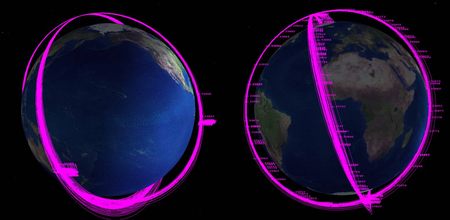 The debris from all this collision will, of course, threaten all the satellites at this most popular of altitudes but it does threaten Iridium satellites the most. Take a look at the picture below, which shows where Iridium orbits cross the debris tubes near the North Pole. Actually, all the Iridium satellites pass through both debris tubes twice per orbit. That’s four times of dramatically increased chances of another collision (this time between a satellite and a piece of debris) every 100 minutes, roughly. Of course, as time goes by, the debris will spread out of the tube because of natural orbital motion and spread more uniformly across the face of the Earth. Unfortunately, this does not reduce the chances of another Iridium satellite being hit; it just makes it a sort of continuous danger.