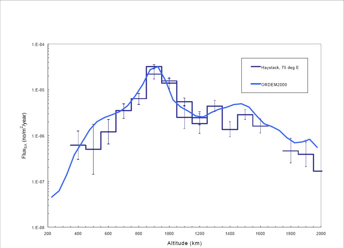 Let’s do the wrong calculation first, because it’s very informative. If all space around the Earth was the same, you could just take the “flux” of space debris through any given point for a specified altitude, multiply it by the area of each satellite and the number of such satellites at that altitude and the time you want to add up all the chances of a collision to get a total probability. In fact, NASA spends a great deal of time determining that flux so it can use it to design debris mitigation for satellites and the Space Station. (See the NASA report on the “Orbital Debris Engineering Model.”) You can see the flux of space debris with diameters greater than 1 cm here . (Note that this is pre-2007.) It was created using the Haystack radar to survey the space junk density. I used this flux to calculate the “average” collision rate shown above. Note that it is independent of errors on orbital elements etc. that plague calculations of near misses between two specific objects. It predicts that an operational satellite should be hit by a piece of space debris greater than 1 cm in diameter about once every 37 years. That’s wrong, so don’t get too excited about it. Instead, let’s see why it is wrong.