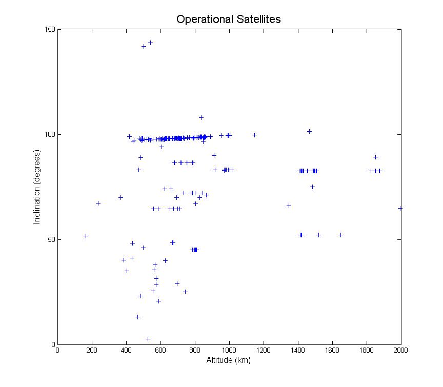 very nice — could you make a plot of the number of satellites vs. inclination in a given altitude range: eg. 700 to 900km? …Or else, a 3D plot that has the number of satellites along the 3rd axis to lift the degeneracy? From the 2D plots you have it is hard to get a sense of the population of satellites at a given altitude as I believe many of the data points may be falling on the almost exact same value. i.e. what looks like one datapoint may conceal several satellites (?).