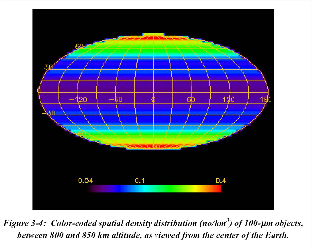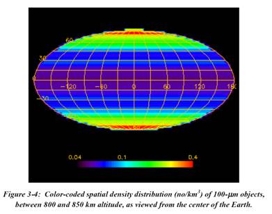 Space around the Earth is not uniform: it is “shaped” by the uses humanity puts it to. Near Earth space is dominated by satellites (and space junk) in near-polar orbits. You can see two plots I made, one of the inclination vs. altitude of operational satellites (as defined by the UCS database of satellites) and the same type of plot for all cataloged space objects . Because the near-polar orbits all converge near the poles, the spatial density near those two spots increases dramatically. The NASA plot below, for a specific orbital altitude range, demonstrate this. It shows that the flux near the polar regions are almost 10 times what it is in the equatorial regions. Of course, satellites spend only a fraction of their time near the poles. Because of that, it doesn’t seem to be quite enough to account for the number of collisions (that’s based on a very qualitative assessment and not a calculation) but it illustrates the problem. I also have to emphasize that this is a “back of the envelop calculation.”