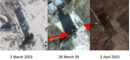 If you haven’t seen it, check out ISIS’s latest report on North Korea’s missile launch preparation which shows an image of the launch site taken on 26 March, 2009. Strangely, ISIS seems to emphasize the crane on top of the gantry. (Something that has been there for years.) I think there are two other, more interesting features to the photograph. First, the gantry seems to have been opened up (note that in the 2003 images the gantry seems slimmer than the current image). This would seem to indicate that the walkways normally associated with gantries have been moved outward to accept the stacking of the different stages. Another interesting feature is the fact that you cannot distinguish the individual floors in the gantry shadow; a feature that is clearly visible in the other two images. Those 2003 images bracket the Sun’s elevation of the current image and since both show the floors, I think we could reasonably expect to see them in the shadow unless North Korea had placed curtains on the gantry to block the view of oblique satellite photographs.