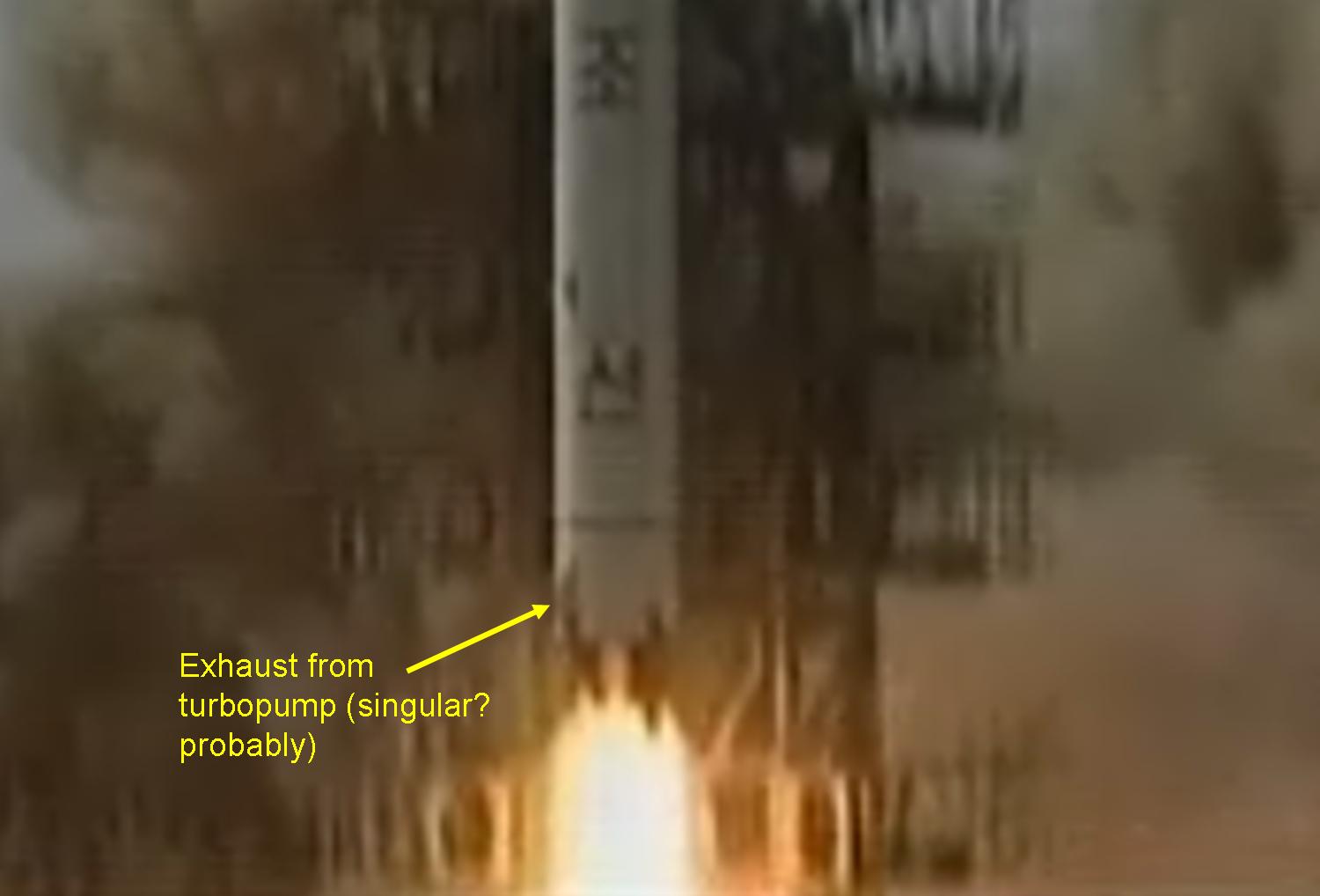 Update: The cluster of engines seems to use a single turbopump. Its still possible, of course, that each nozzle has its own turbopump but given the location of the exhaust exit, Im guessing that its a single pump. This implies a both a reduction in weight and an increase in sophistication on North Korea’s part. This image is a lot more convincing when you look at it in the video because you can see the exhaust plume from the turbopump pulsing.