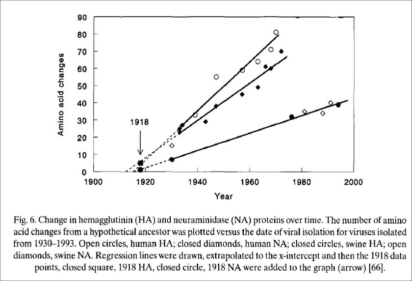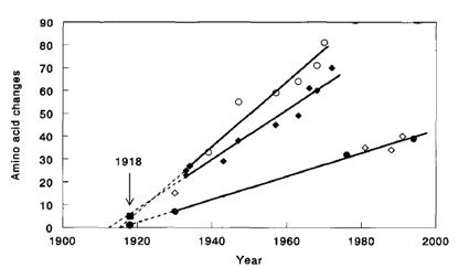 The Mother of All Influenza Viruses. This graph indicates that all the H1N1 viruses that circulated since 1918 were mutations of the Spanish Flu. (From Taubenberger and Reid, Influenza, ed. C. W. Potter, p. 118.)