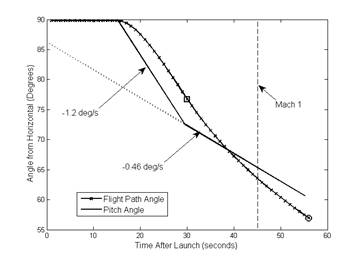 The reconstructed flight path angle and the fitted pitch program are shown as a function of time after launch. The flight path angle is found using the fitted trajectory to provide a smooth curve. The start and stop of the fitted trajectory are marked with a square and a circle respectively. (Note that the rocket passes through the speed of sound during the fitted trajectory.) The slope from the portion corresponding to the reconstructed trajectory is projected back, as a dotted line, to the launch.
