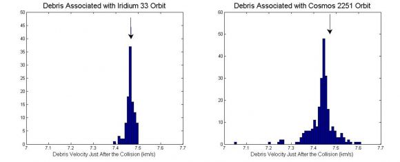 If Cosmos 2251 was a more heavily constructed satellite whose fragments tend to be heavier than those of Iridium 33, and a smaller fraction of the vehicle literally vaporized, it is not at all surprising that the Cosmos debris was not subject to quite so great an acceleration in the immediate post-collision environment than the Iridium fragments.