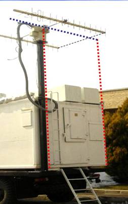 The image to the left is taken from a more suitable perspective for photo-interpretation. The antenna arrays are nearly horizontal and close to being aligned with the rear of the truck. I have drawn two vertical lines continuing up the truck’s rear edges and a third, horizontal, line paralleling the antenna booms. Of course, there are a great number of approximations taken in this drawing. But then again, there are some approximations still to come. The most important of those is to assume that the truck’s rear cabin is approximately two meters in width. With that assumption, we can estimate the boom length to be approximately 2.9 meters long (from radiator to last director). This is consistent with the Omid satellite’s uplink frequency given all the approximations we have made. Either the far antenna in the image is shorter than this (if it is used for the downlink) or they are running the antennas nonoptimally for reception or there is a different receiver somewhere not on the truck.