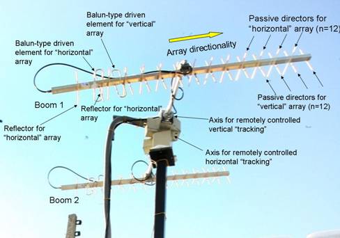 As the image above—taken during a visit to the Iranian Space Center by President Ahmadinejad—shows, there are trucks with potentially suitable antennas. The dual antennas are of a Yagi-Uda design (often simply called a Yagi antenna) with 12 passive “directors,” a looped Balun-type element for radiating the signal and, at the very rear of the array, a somewhat larger “reflector.” The reflector is to ensure that there is a preferred direction to the antenna as opposed to being sensitive to signals from both directions along the boom. The Balun radiator matches the impedance from the simple coaxial cable to the array and the directors increase the “gain” or directionality of the antenna. Interestingly, there are both vertical and horizontal arrays on each boom with the horizontal array set back a quarter wavelength (see below), perfectly suited for detecting or radiating circularly polarized radio waves. That is needed because the Omid satellite tumbles as it orbits and its polarization—while not circular—is directed in an arbitrary, time varying manner. The bulky cable run up to the antenna hub is for controlling the direction of the antenna arrays and could, though there is no way to know from the photo, be capable of autonomous direction if it is set to maximize the strength of the signal.