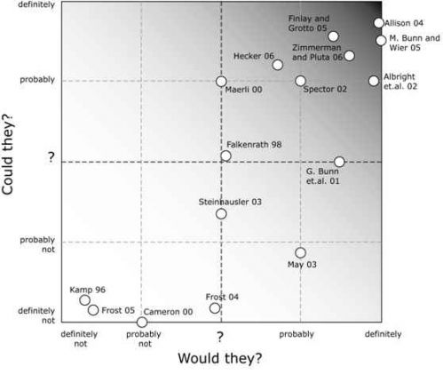 First of all: James forgot the references to go with the dots. I copied them in at the end of this post. I decided about halfway to only include articles (I think Finlay and Grotto is the exception), so ‘Bunn and Wier 05’ is the “Seven Myths” paper, not ‘Securing the Bomb 2005’. That’s part of the reason why Levi isn’t on there, but also because his excellent book was published after this chart was made and it hasn’t been updated since. Dr. Levi got the rare honour of placing his own dot in the diagramme 🙂 Note also that these references far from exhaust the literature, and I’ve only included papers that would fit in the diagramme at all and only one paper per author (except Frost, who changed his mind at some point)