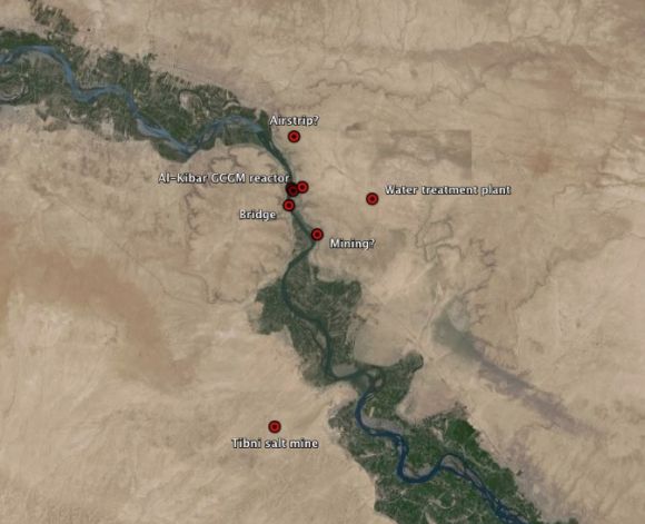 While there certainly seems to be no reprocessing facilities around, there are mining activities in the area, including the Tibnah Salt Mine, which is located some 17 kilometers south of the destroyed facility (you’ll find the mine at 35°33’9.72“N 39°48’41.60“E). The Syrian General Company for Phosphates and Mines operates the salt mine, which has been known to operate in the area for years, not least because an Australian firm did the field mission and basic engineering survey for a mine expansion back in 1985.